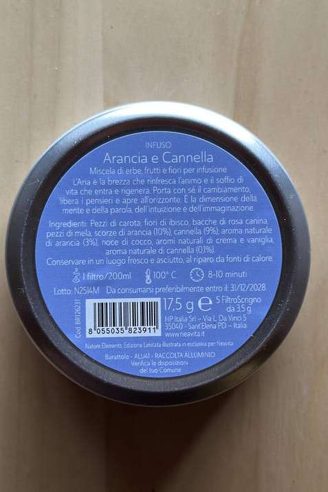 Pezzi di carota, fiori di ibisco, bachhe di rosa canina, pezzi di mela, scorze arancia, cannella, aroma naturale arancia, noce di cocco, aroma naturale di crema e vaniglia, aroma naturale di cannella.